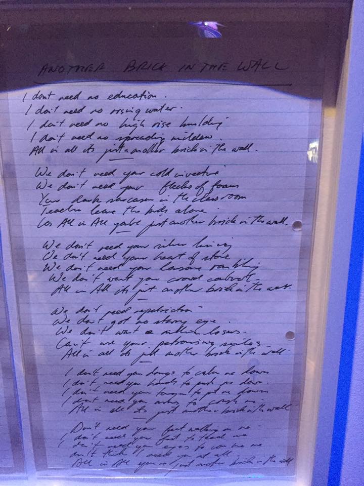 ‘We don’t need no education’ non è da intendere come un inno all’ignoranza, al contrario, non c’è mente più saggia di quella propensa alla curiosità e alla rottura degli schemi, se gli schemi sono imposti e fini a se stessi. L’oppressione e la repressione del pensiero, si sa, hanno storicamente portato a dittature e stragi, temi a cui da sempre Waters si è mostrato sensibile. E in queste poche righe di testo sono racchiusi molteplici significati.